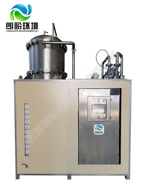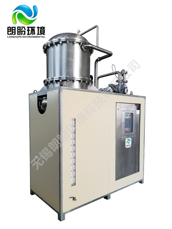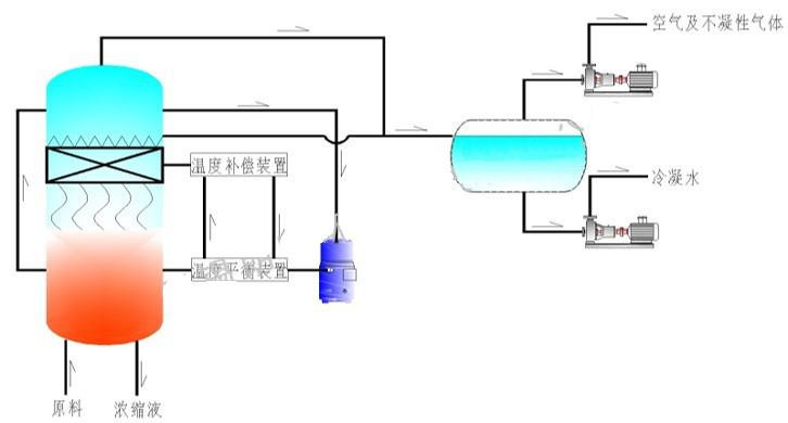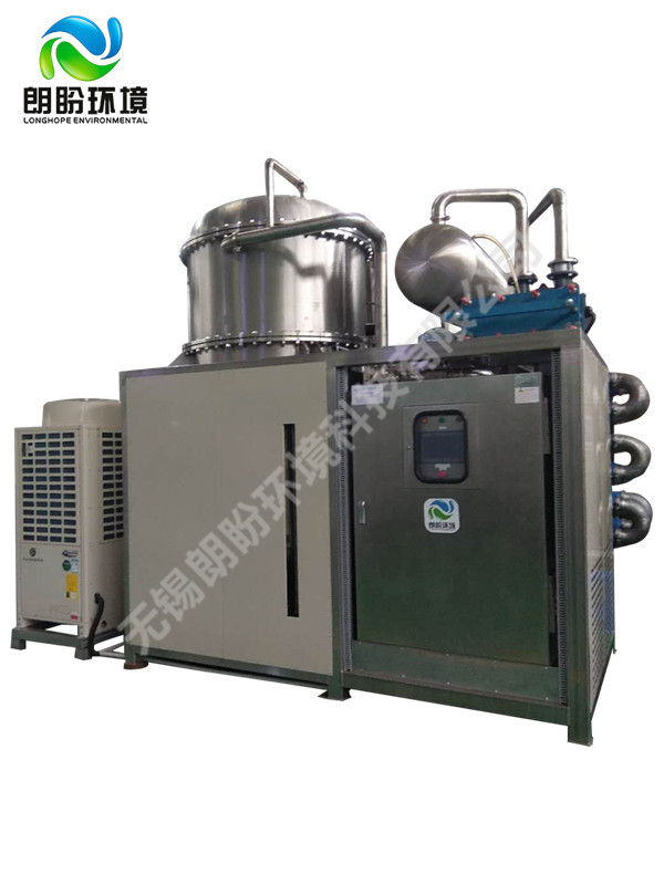 熱泵濃縮蒸發(fā)器的原理是物料的沸點隨著壓強的降低而降低。低溫節(jié)能濃縮設(shè)備整體保持真空狀態(tài),濃縮室的真空度約為95%~97%,在此壓強下水的沸點為35℃~37℃,系統(tǒng)無需配備進料泵,利用蒸發(fā)室的負(fù)壓將物料吸進蒸發(fā)室,通過強制循環(huán)方式將物料循環(huán)霧化,傳輸至換熱器上,物料中水分被蒸發(fā),物料連續(xù)循環(huán)霧化,通過蒸發(fā)室液位自動補料,濃度達(dá)到要求后作為濃縮液排出設(shè)備。濃縮液一般粘度較大,需采用泵抽出。